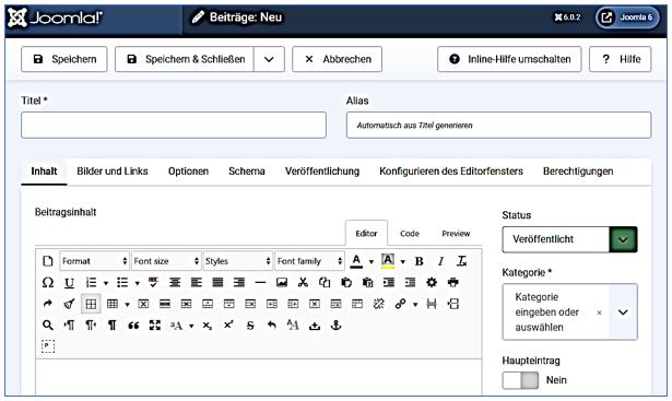 | ✍️ TinyMCE-Editor | Version 6 (in Joomla 5.0) | Aktualisiert auf Version 8.0.1 mit vielen Fehlerbehebungen und verbesserter Barrierefreiheit |